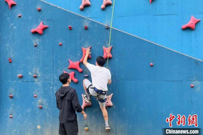 7月12日,两名学生在江汉大学体验攀岩项目。中新社记者 武一力 摄
