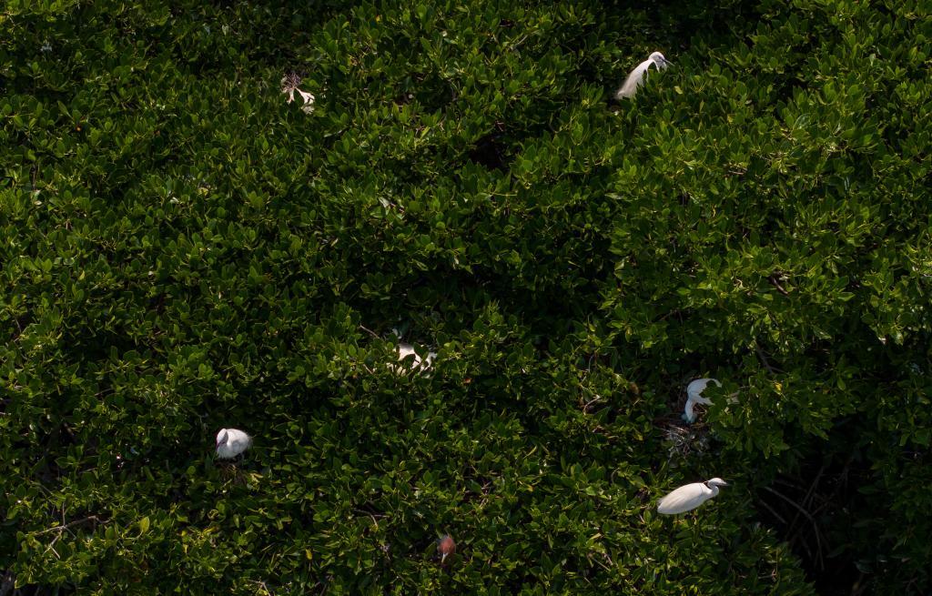 5月17日,在广东湛江金牛岛,鹭鸟在红树林上栖息(无人机照片)。新华社记者 毛思倩 摄