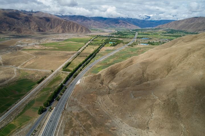 俯瞰西藏拉萨市至日喀则市区间的交通网络,从左至右依次为农村公路、铁路、国道和高等级公路(2024年6月27日摄,无人机照片)。新华社记者 旦增尼玛曲珠 摄