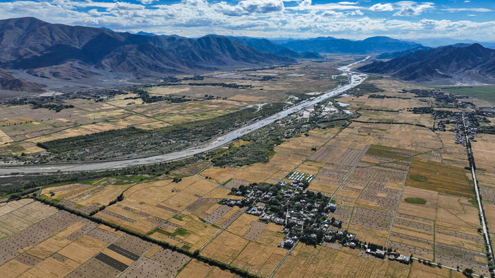西藏日喀则市年楚河流域纵横交错的乡村道路(2023年9月6日摄,无人机照片)。新华社记者 晋美多吉 摄