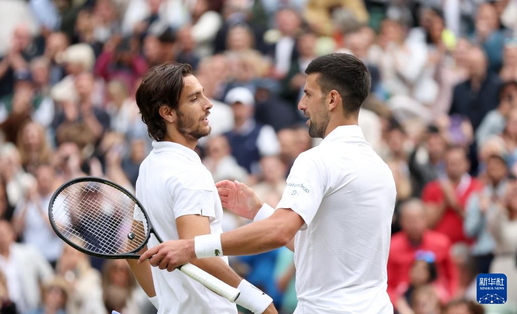 7月12日,焦科维奇(右)与穆塞蒂在比赛后相互致意。新华社记者 李颖 摄