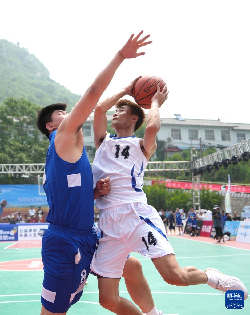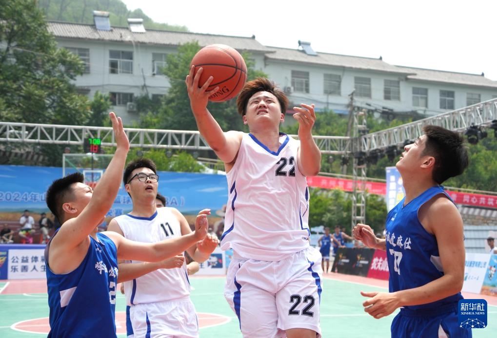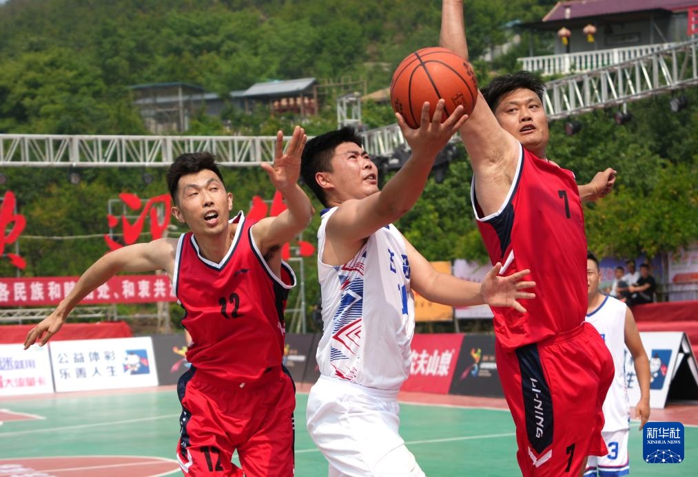 7月12日,枣庄市峄城区古邵镇代表队球员胡臣(中)在比赛中上篮。新华社记者 徐速绘 摄