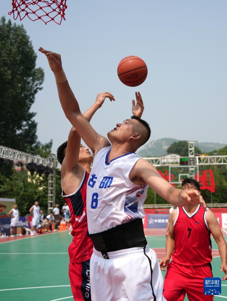 7月12日,枣庄市峄城区古邵镇代表队球员赵鹏(前)在比赛中争抢篮板球。新华社记者 徐速绘 摄