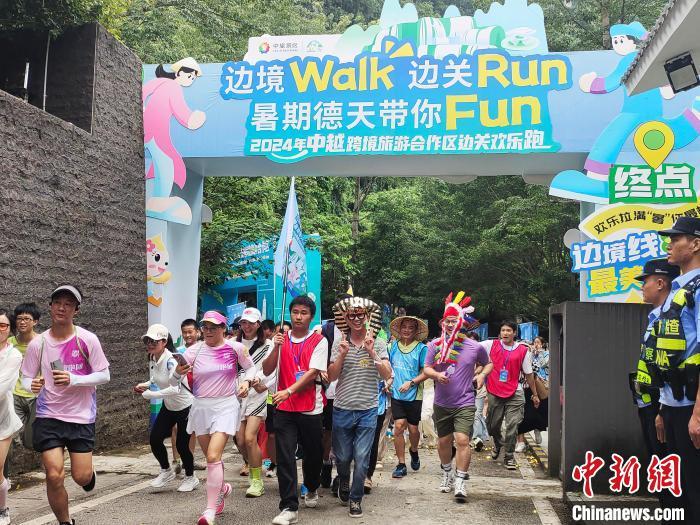 中新社崇左7月13日电 (黄艳梅 汤细藜)来自中国各地的逾600名选手,13日在中国首个跨境旅游合作区——中越德天(板约)瀑布跨境旅游合作区(下称“合作区”)体验中越边关欢乐跑活动,领略中越两国秀美景色及人文风情。