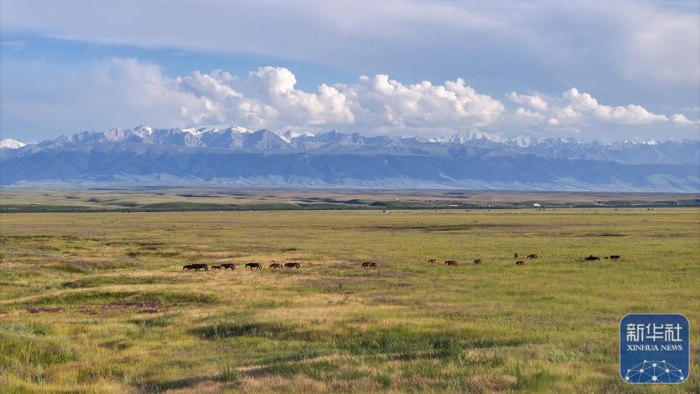 这是7月12日在新疆昭苏拍摄的草原和雪山(无人机照片)。