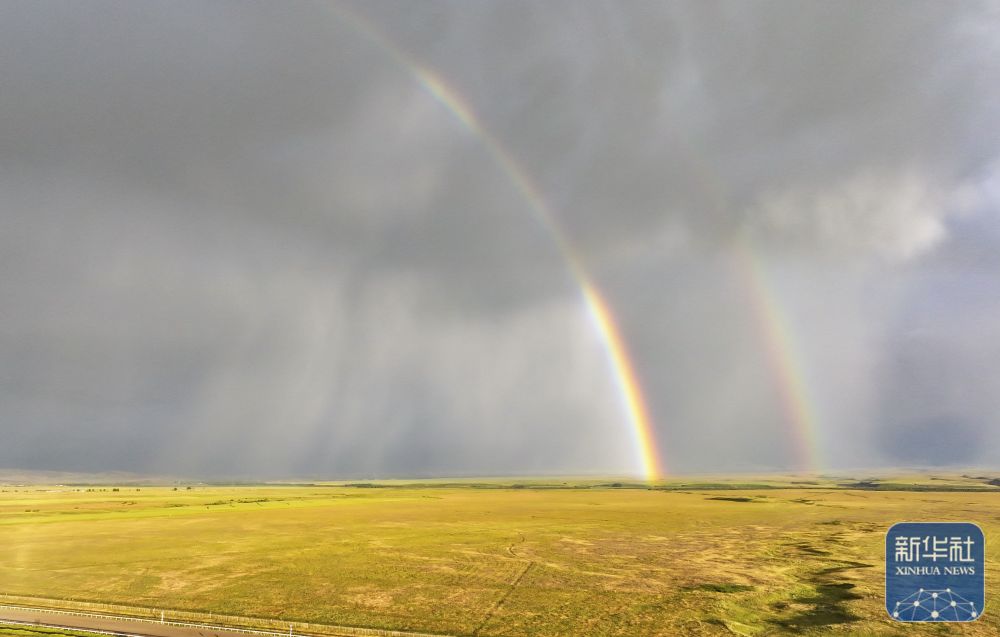 这是7月12日在新疆昭苏拍摄的雨后彩虹(无人机照片)。