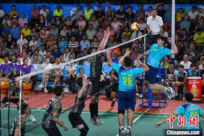 7月13日晚,2024年“九九杯”海南(文昌)乡镇排球联赛铺前站迎来一场中马排球友谊赛。图为比赛现场热闹场景。中新网记者 骆云飞 摄