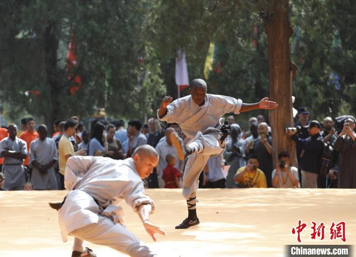 7月14日,2024少林考功总决赛继续在中国嵩山少林寺举行。13日以来,来自47个国家和地区的逾百位少林功夫习练者在此展开比拼,争夺“2024世界少林功夫之星”。以“千年传承,历久弥新;少林文化,人类共享”为主题的是次大赛由少林寺主办。图为国外选手同台竞技。中新社记者 阚力 摄