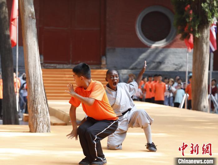 7月14日,2024少林考功总决赛继续在中国嵩山少林寺举行。13日以来,来自47个国家和地区的逾百位少林功夫习练者在此展开比拼,争夺“2024世界少林功夫之星”。以“千年传承,历久弥新;少林文化,人类共享”为主题的是次大赛由少林寺主办。图为中外选手同台竞技。中新社记者 阚力 摄