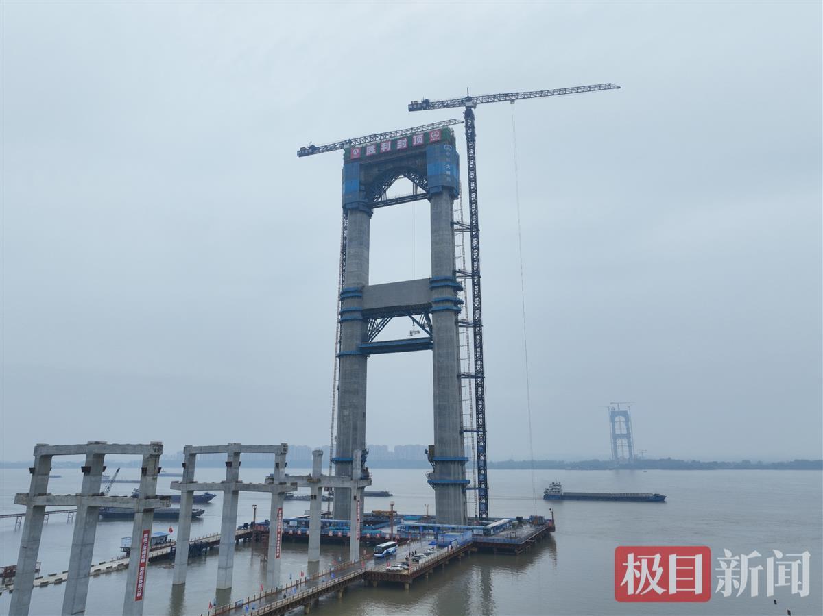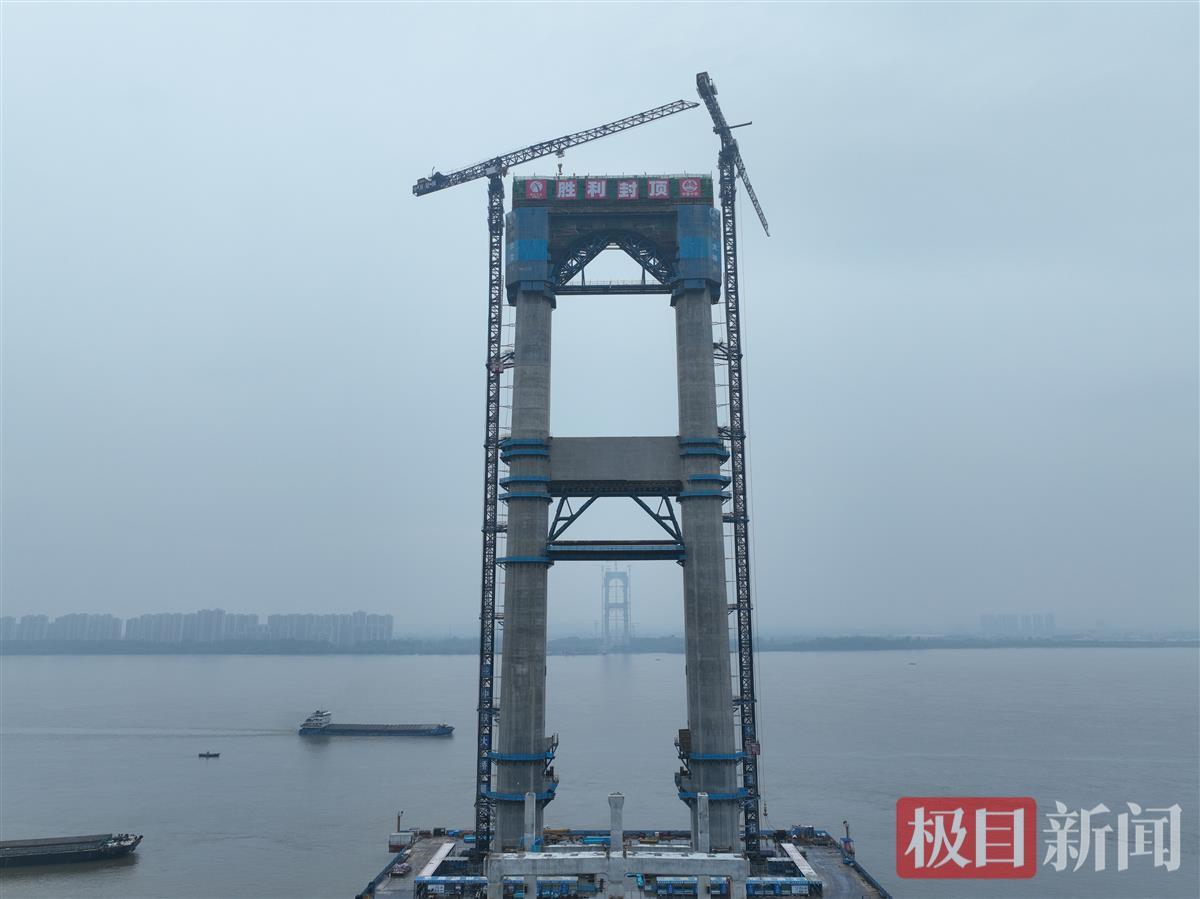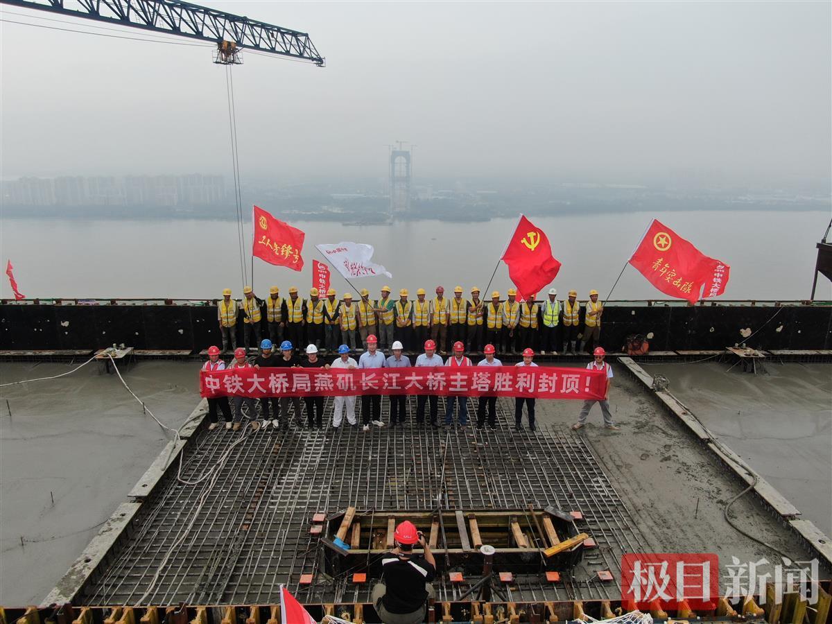 7月14日,随着燕矶长江大桥水中主塔最后一方混凝土浇筑完成,由湖北交投投资、中铁大桥局承建的世界最大跨度四主缆体系悬索桥主塔全部封顶,标志着大桥建设取得重大突破,下一步将转入主缆施工阶段。此次封顶的主塔位于大桥北岸,也是全桥最高主塔。
