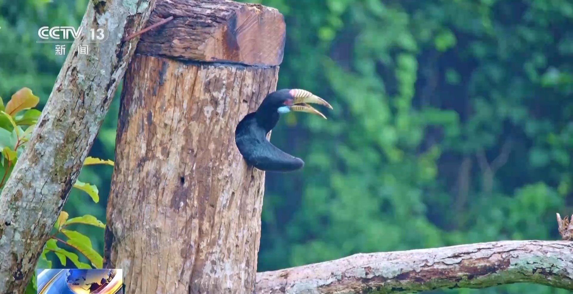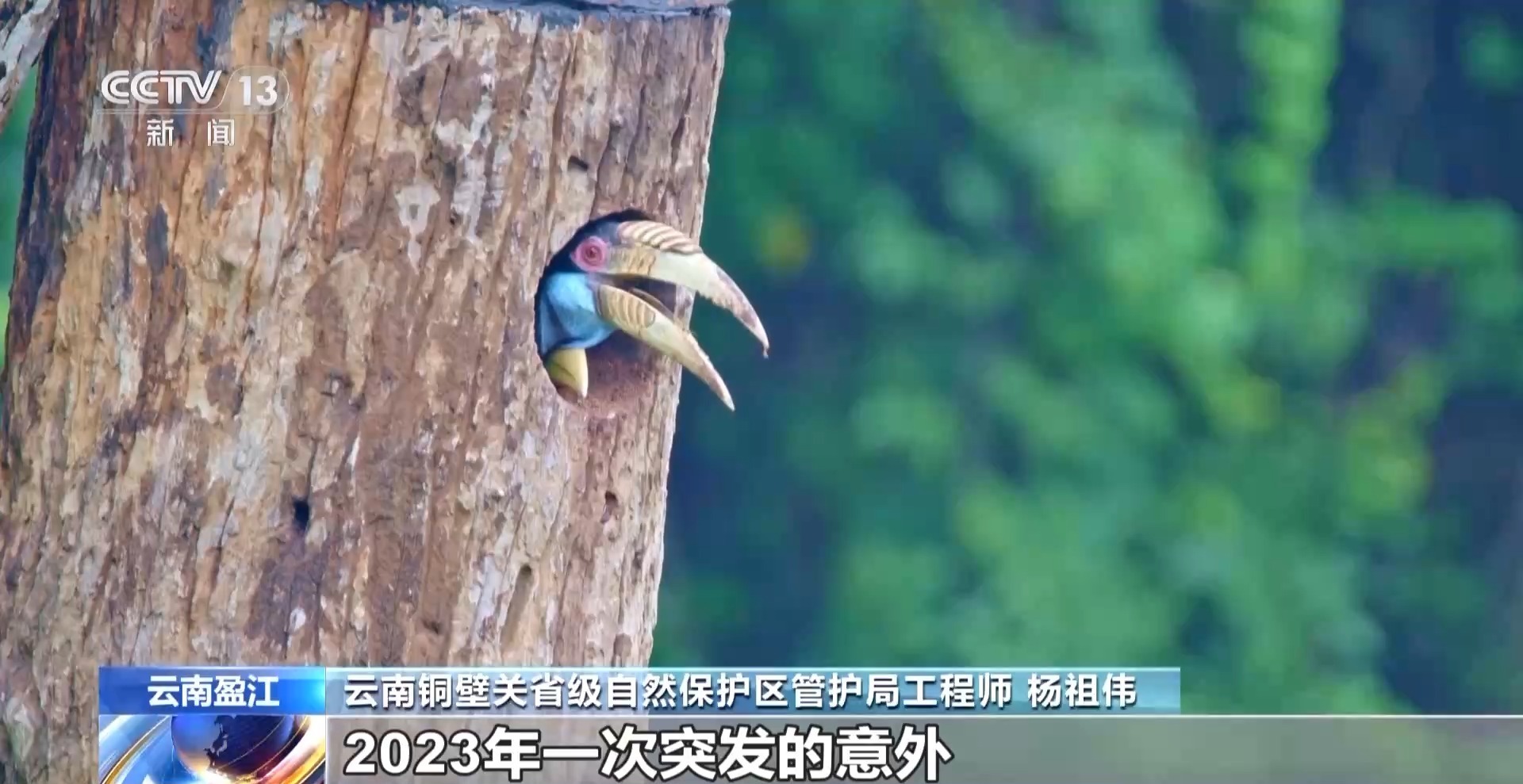 云南铜壁关省级自然保护区管护局工程师 杨祖伟:2023年一次突发的意外,洪崩河区域一巢花冠皱盔犀鸟的天然巢穴被大风拦腰吹断了之后,我们保护区的科研员就及时组织人员去把这个天然巢洞截取下来,测量了它里面的巢洞、巢高这些相关的数据,设计制作了一个人工巢箱。2024年1月下旬左右,就把它挂到了被损坏的巢树边的另外一棵树上。