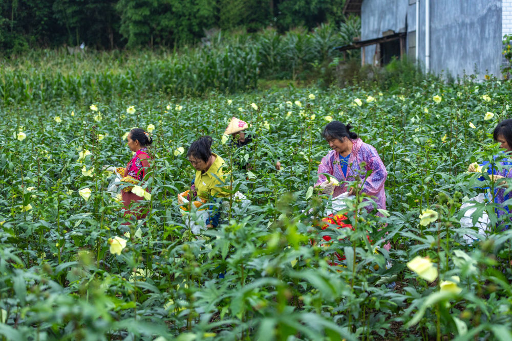 在重庆市巫溪县尖山镇百步村,村民在采收金花葵。新华社记者黄伟 摄
