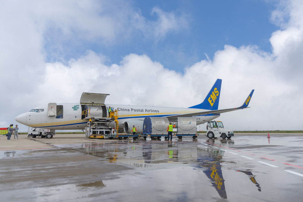 在重庆巫山机场,工作人员将打包好的巫山脆李运送至“邮运通”极速鲜邮航专机。新华社记者黄伟 摄
