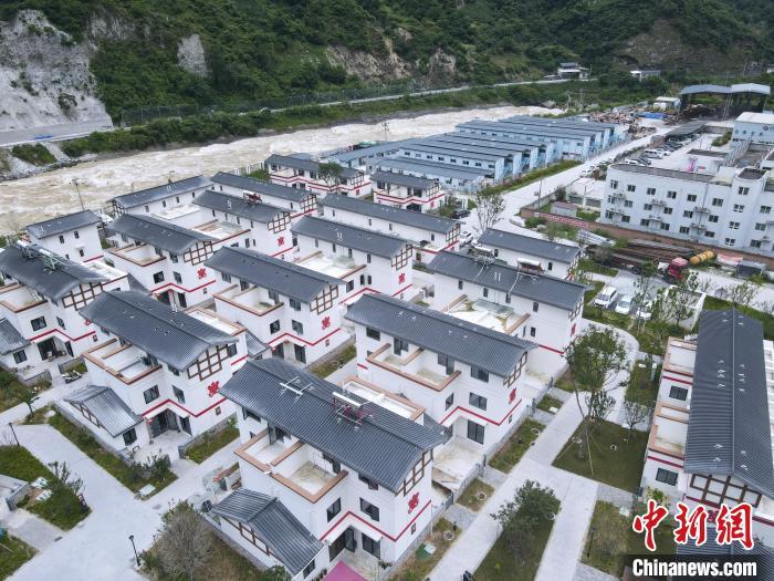 距离磨西镇不远的德威镇奎武村同样受到地震的严重波及。中新网记者13日来到灾后重建集中安置点,一幢幢绘有“如意结”“穿斗装饰”等泸定传统建筑元素的安置房拔地而起,沿着大渡河岸边依次排开。