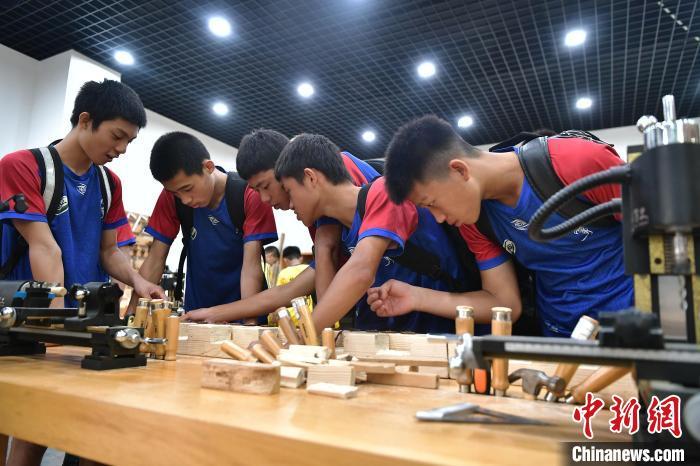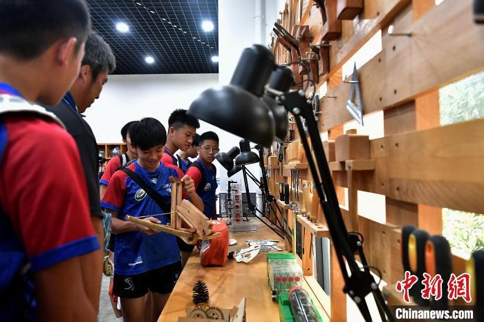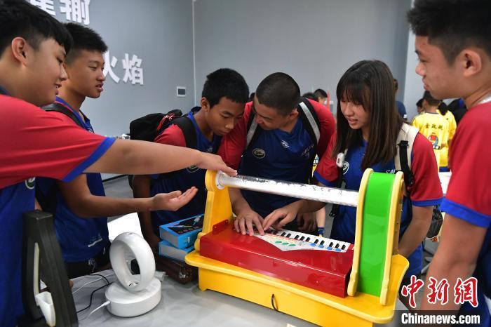 7月14日,台湾学生在百工创客教室参观。当日,参加第十二届海峡青年节·第九届海峡两岸(福建)青年英式橄榄球交流赛的台湾桃园市立石门中学一行走进福州市仓山区金港湾实验学校,与该校学生交流互动,缔结友谊。中新社记者 张斌 摄