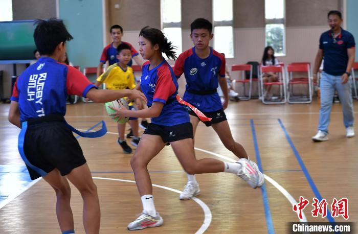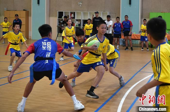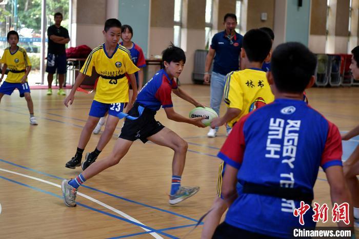 7月14日,台湾学生与金港湾实验学校学生(黄)一起进行橄榄球交流游戏(腰旗)友谊比赛。当日,参加第十二届海峡青年节·第九届海峡两岸(福建)青年英式橄榄球交流赛的台湾桃园市立石门中学一行走进福州市仓山区金港湾实验学校,与该校学生交流互动,缔结友谊。橄榄球交流赛13日在福州海峡奥林匹克体育中心举行,来自两岸的52支队伍、近800名运动员参与。中新社记者 张斌 摄