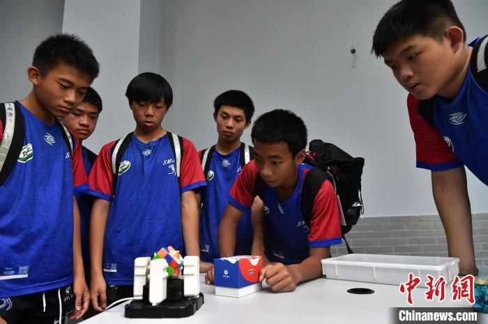 7月14日,台湾学生在观看魔方机器人表演。当日,参加第十二届海峡青年节·第九届海峡两岸(福建)青年英式橄榄球交流赛的台湾桃园市立石门中学一行走进福州市仓山区金港湾实验学校,与该校学生交流互动,缔结友谊。中新社记者 张斌 摄