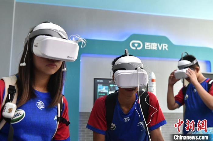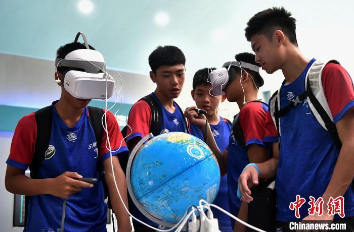 7月14日,台湾学生在VR教室体验VR。当日,参加第十二届海峡青年节·第九届海峡两岸(福建)青年英式橄榄球交流赛的台湾桃园市立石门中学一行走进福州市仓山区金港湾实验学校,与该校学生交流互动,缔结友谊。中新社记者 张斌 摄