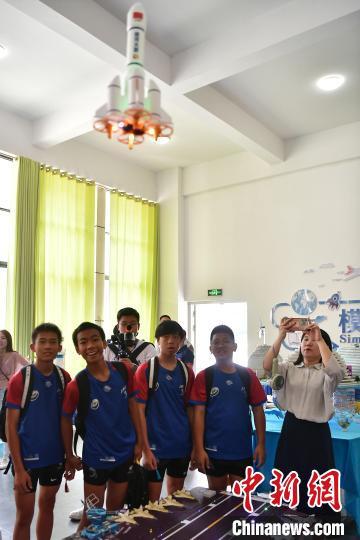 7月14日,台湾学生观看“火箭”模拟发射。当日,参加第十二届海峡青年节·第九届海峡两岸(福建)青年英式橄榄球交流赛的台湾桃园市立石门中学一行走进福州市仓山区金港湾实验学校,与该校学生交流互动,缔结友谊。中新社记者 张斌 摄