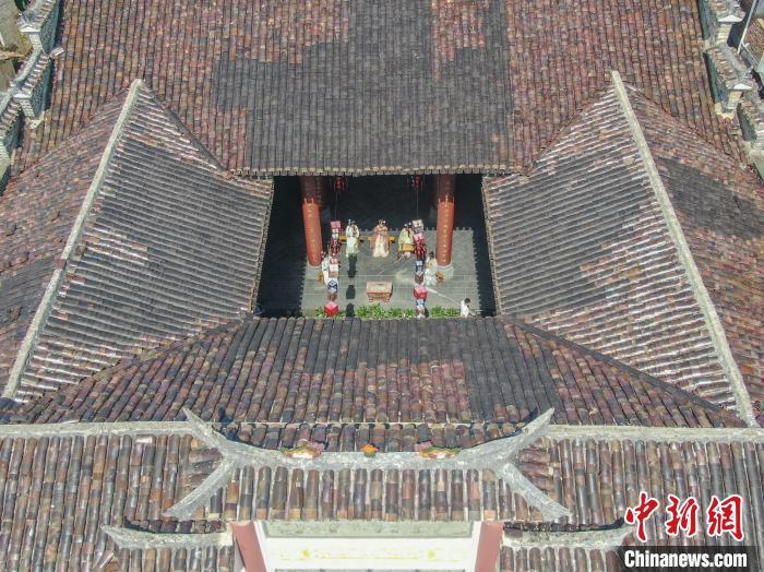 7月14日,江西广昌县驿前古镇,一场国潮展演活动在古镇的赖氏宗祠内举行。驿前古镇是中国传统村落,依山傍水,与莲池为邻,现有保存完整并且有代表性的明清古建筑50余栋,高墙深院、飞檐翘脊,建筑风格古朴典雅,建筑中的石雕、木雕、砖雕大多以莲为主题。(无人机照片)中新社记者 刘力鑫 摄