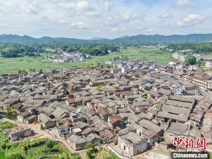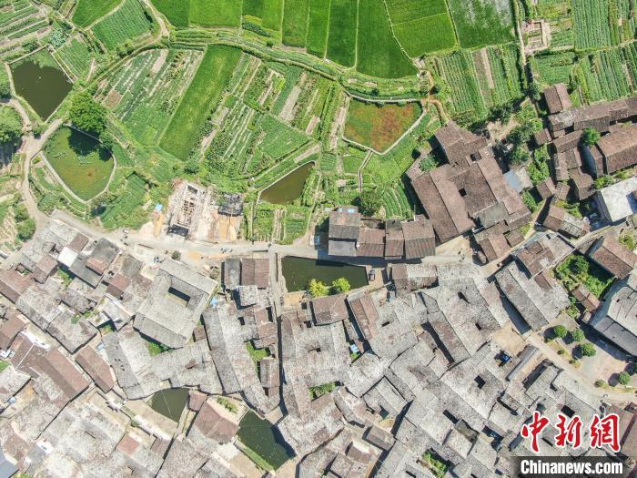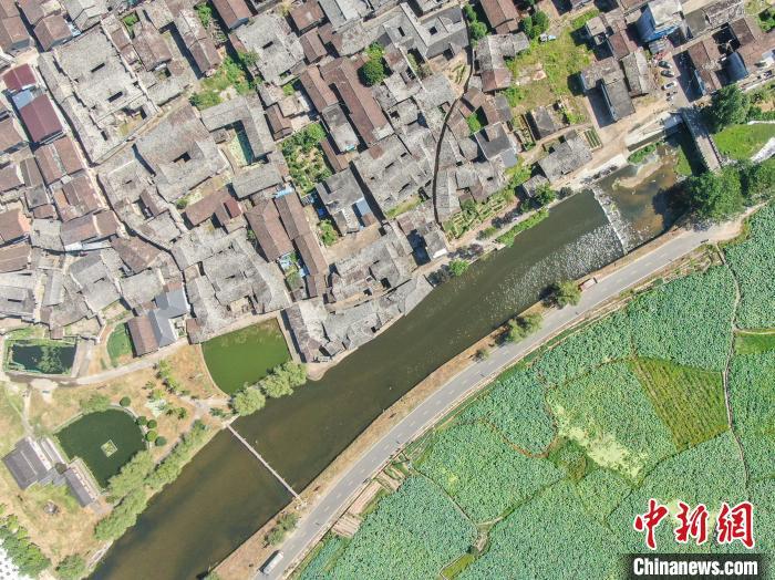 7月14日,航拍江西广昌县驿前古镇,风景秀美。驿前古镇是中国传统村落,依山傍水,与莲池为邻,现有保存完整并且有代表性的明清古建筑50余栋,高墙深院、飞檐翘脊,建筑风格古朴典雅,建筑中的石雕、木雕、砖雕大多以莲为主题。(无人机照片) 中新社记者 刘力鑫 摄