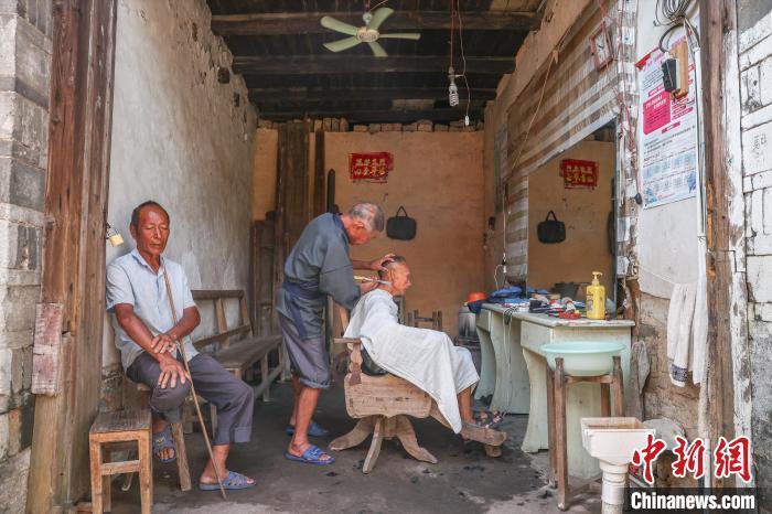 7月14日,江西广昌县驿前古镇,村民在一家传统理发店内理发。驿前古镇是中国传统村落,依山傍水,与莲池为邻,现有保存完整并且有代表性的明清古建筑50余栋,高墙深院、飞檐翘脊,建筑风格古朴典雅,建筑中的石雕、木雕、砖雕大多以莲为主题。中新社记者 刘力鑫 摄
