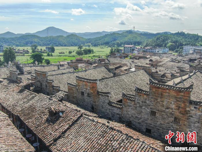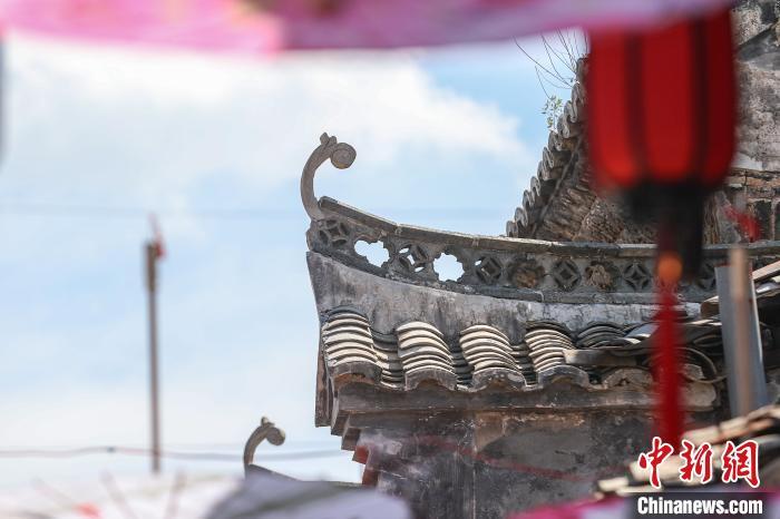 7月14日,江西广昌县驿前古镇内的古建筑一角。驿前古镇是中国传统村落,依山傍水,与莲池为邻,现有保存完整并且有代表性的明清古建筑50余栋,高墙深院、飞檐翘脊,建筑风格古朴典雅,建筑中的石雕、木雕、砖雕大多以莲为主题。中新社记者 刘力鑫 摄