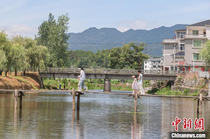 7月14日,江西广昌县驿前古镇,游客从一座木桥上走过。驿前古镇是中国传统村落,依山傍水,与莲池为邻,现有保存完整并且有代表性的明清古建筑50余栋,高墙深院、飞檐翘脊,建筑风格古朴典雅,建筑中的石雕、木雕、砖雕大多以莲为主题。中新社记者 刘力鑫 摄