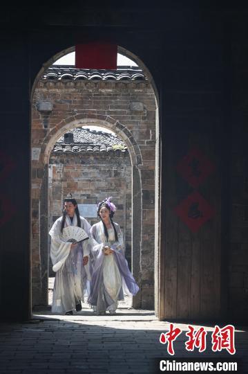 7月14日,江西广昌县驿前古镇,身着汉服的游客在古镇内参观游览。驿前古镇是中国传统村落,依山傍水,与莲池为邻,现有保存完整并且有代表性的明清古建筑50余栋,高墙深院、飞檐翘脊,建筑风格古朴典雅,建筑中的石雕、木雕、砖雕大多以莲为主题。中新社记者 刘力鑫 摄
