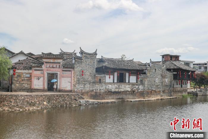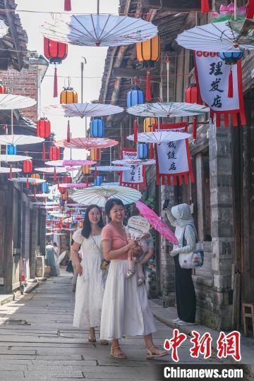 7月14日,江西广昌县驿前古镇,游客在古镇内参观游览。驿前古镇是中国传统村落,依山傍水,与莲池为邻,现有保存完整并且有代表性的明清古建筑50余栋,高墙深院、飞檐翘脊,建筑风格古朴典雅,建筑中的石雕、木雕、砖雕大多以莲为主题。中新社记者 刘力鑫 摄
