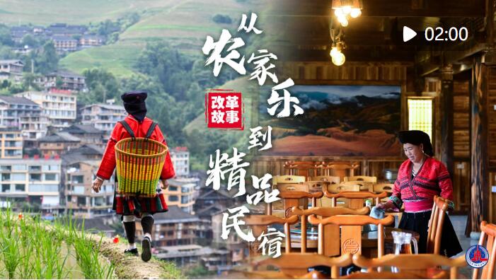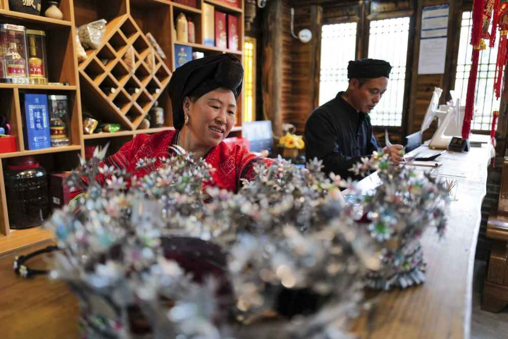 大寨村的老支书潘宝玉(右)和妻子潘保芬在自家民宿前台工作(6月26日摄)。他们是村里最早的民宿经营者。