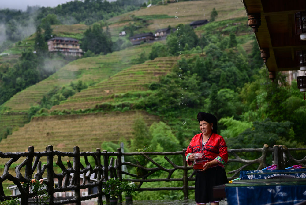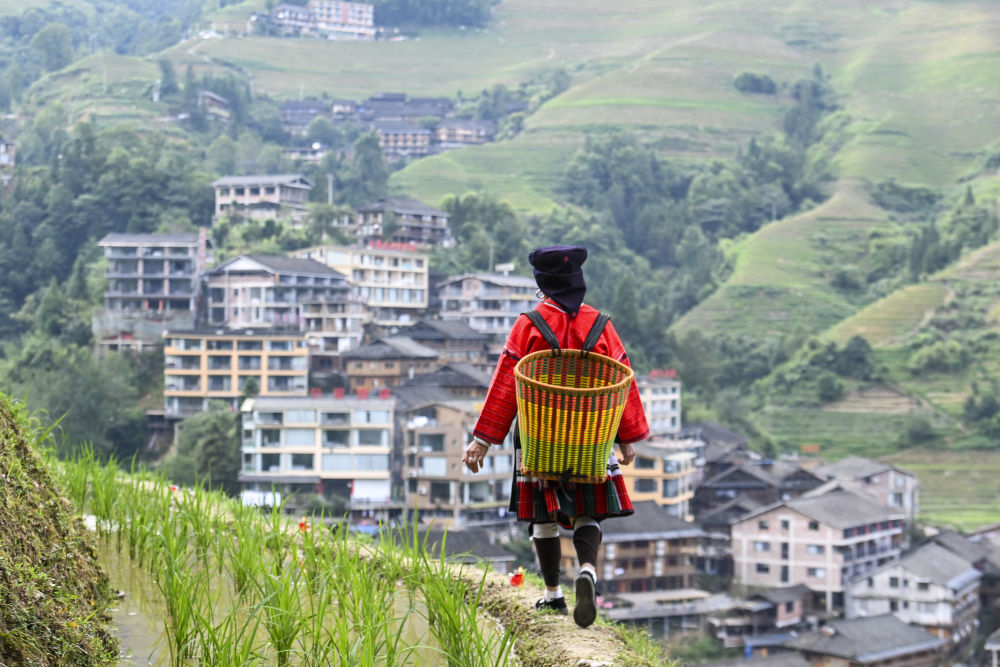 7月10日,一位瑶族村民行走在大寨村的梯田里。
