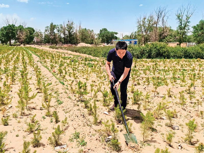 内蒙古包头市固阳县国营林场场长秦岭在林场苗圃查看碳汇造林苗木培育情况(2024年5月7日摄) 郝嘉鑫摄