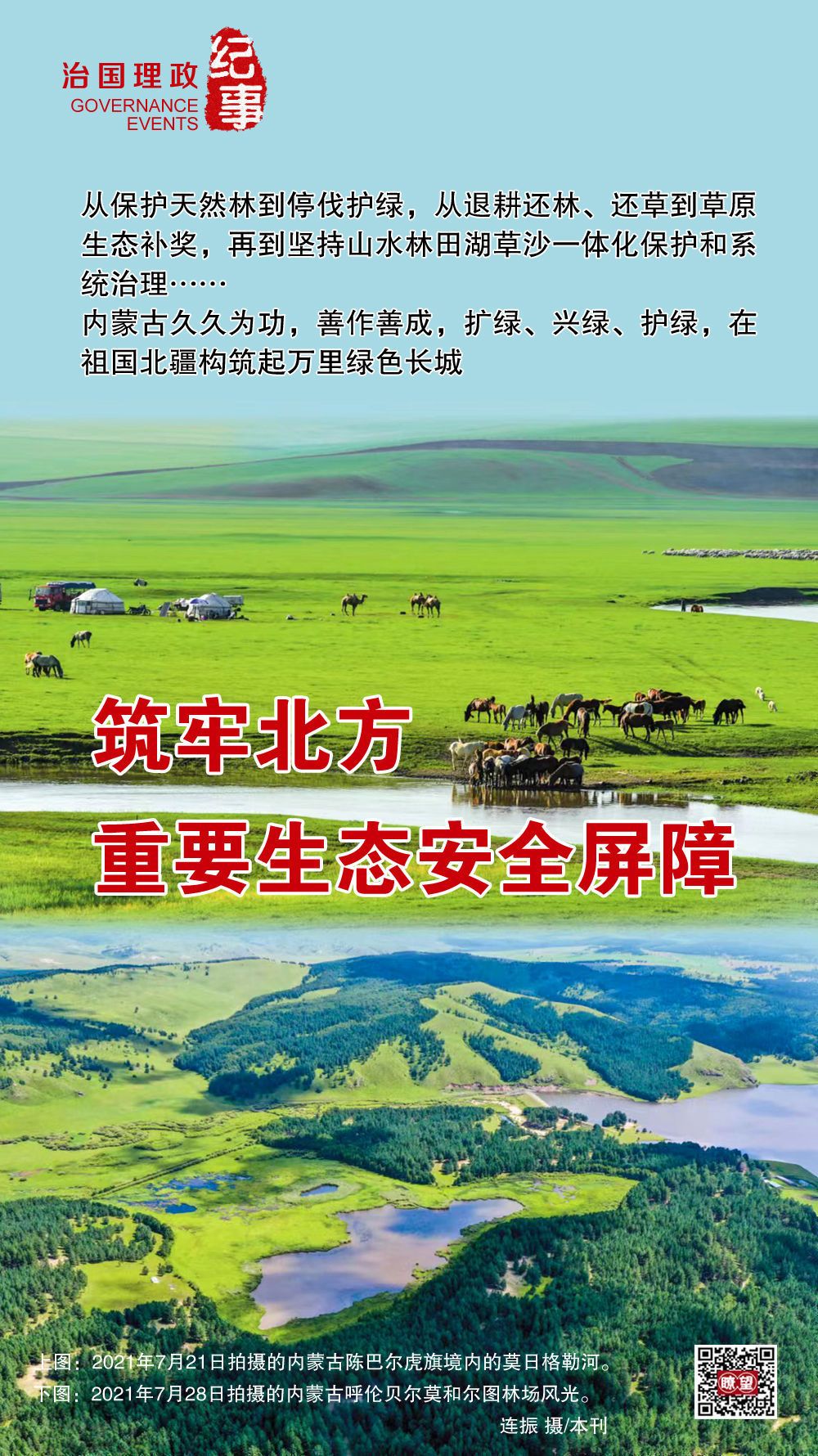 从保护天然林到停伐护绿,从退耕还林、还草到草原生态补奖,再到坚持山水林田湖草沙一体化保护和系统治理……内蒙古久久为功,善作善成,扩绿、兴绿、护绿,在祖国北疆构筑起万里绿色长城。