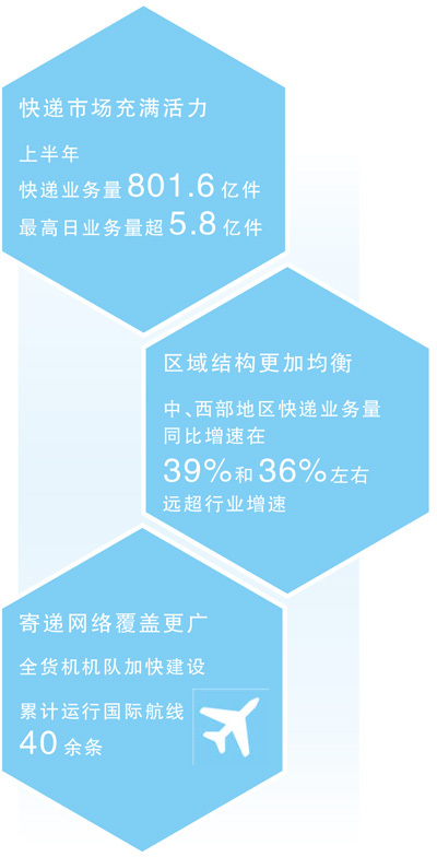 看发展动力,上半年,快递市场充满活力、运行良好,最高日业务量超5.8亿件。