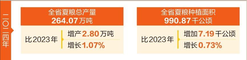 播种面积稳步增长。全省夏粮种植面积990.87千公顷(1486.30万亩),比2023年增加7.19千公顷(10.78万亩),增长0.73%。其中,谷物播种面积515.69千公顷(773.54万亩),比2023年减0.17%。豆类播种面积310.01千公顷(465.01万亩),比2023年增长1.85%。薯类播种面积165.17千公顷(247.75万亩),比2023年增长1.52%。