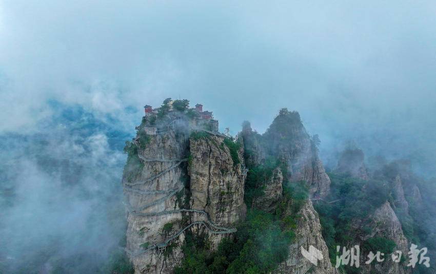 7月13日,游客在武当大明峰玉殿欣赏美景。大明峰位于丹江口关山镇罗马沟村,是武当山72峰之一,峰顶玉殿由300吨玉石打造,通体由9999块伊朗玉构成,站在峰顶远眺,奇峰耸立,云雾缭绕,不禁让人心旷神怡。近年来,大明峰景区先后建有悬空栈道、山谷游步道、高山滑道、玻璃栈道、彩虹桥等,方便游客观光旅游。(湖北日报全媒记者 田悦 摄)