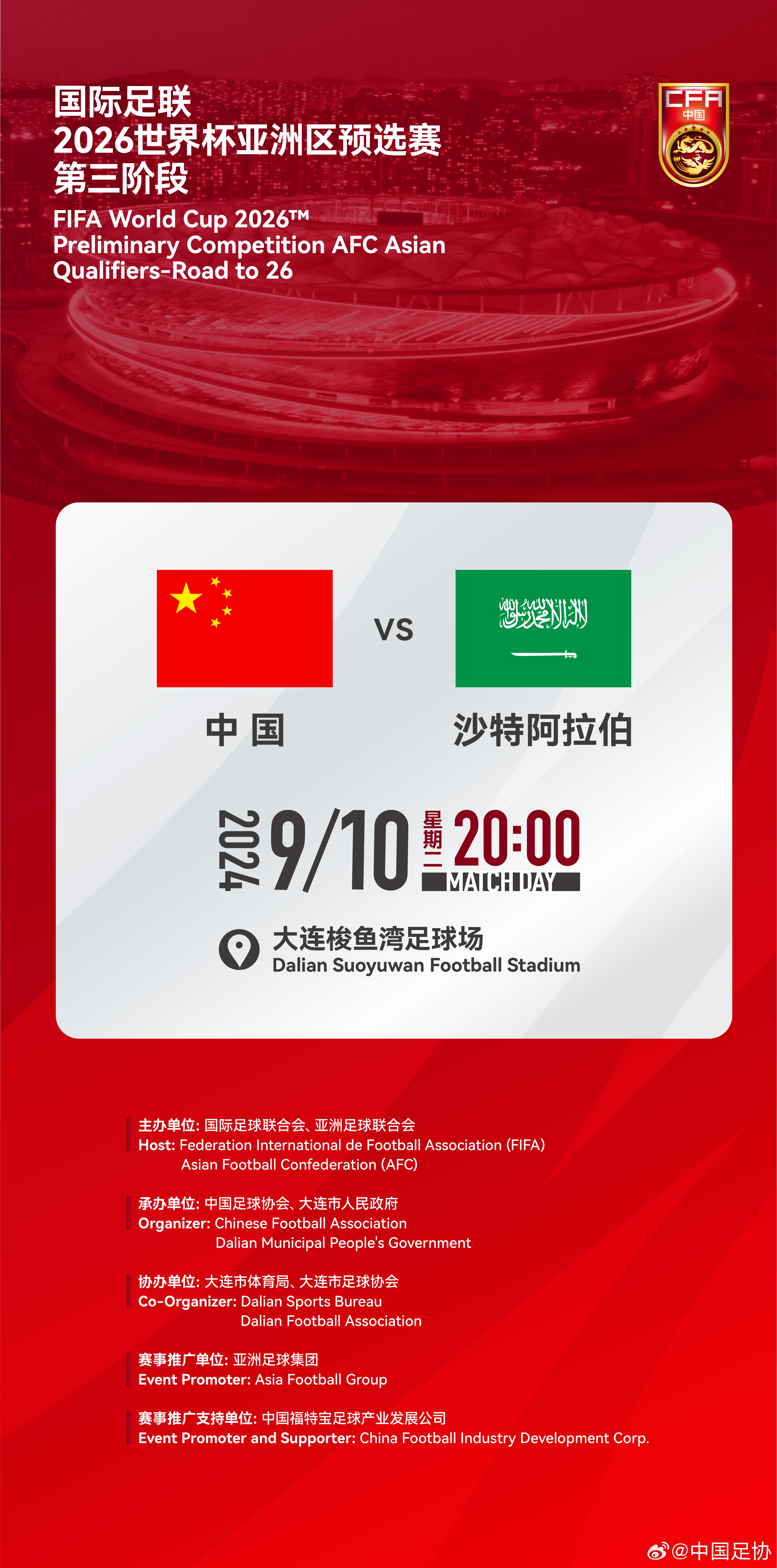 中国男足世预赛18强赛第二轮主场vs沙特的比赛定于9月10日20点开球,地点为大连梭鱼湾球场。