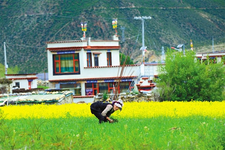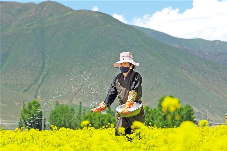墨竹工卡县唐加乡拉东村村民正在油菜花田里施肥。