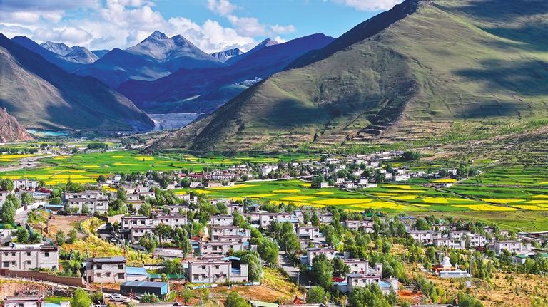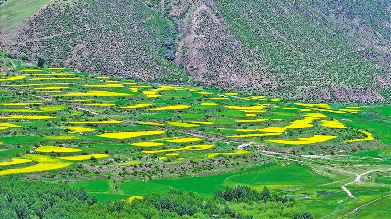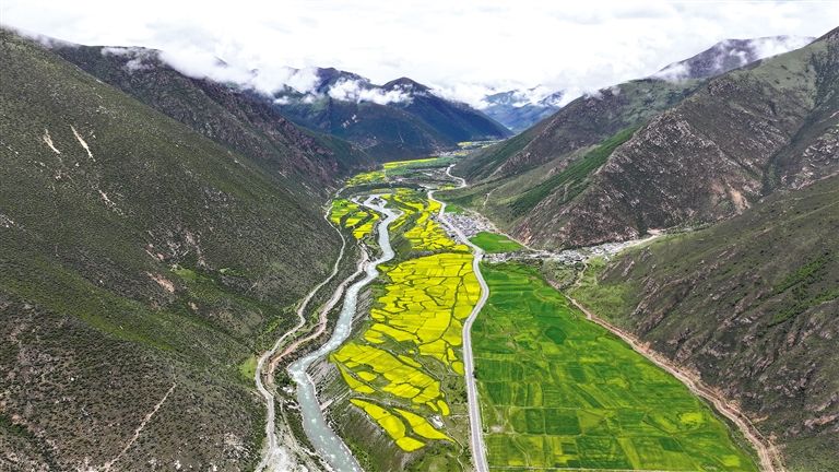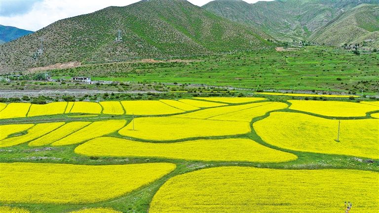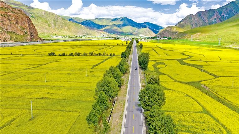 最近,墨竹工卡县迎来了油菜花的盛开时节。放眼望去,满目的油菜花如同金黄色的毯子般铺展开来,在微风中摇曳,散发出迷人的香气。一团团、一簇簇的金黄色花朵点缀在田野上,流动着浓浓夏意。成片的花海与蜿蜒的农村公路、错落有致的村居共同构成了一幅和谐美丽的田园风景图。