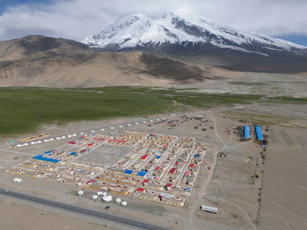 新疆慕士塔格峰脚下的阿克陶县布伦口乡苏巴什村三小队(7月2日摄,无人机照片)。新华社记者 胡虎虎 摄