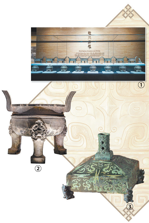 图①:随州曾侯乙墓出土的九鼎八簋。 图②:安徽博物院藏铸客大鼎。 图③:绍兴坡塘狮子山306号墓出土的方座形器。 以上图片均为张昌平提供 |