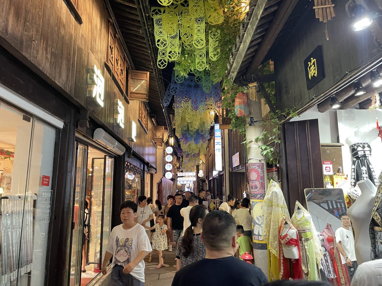 “今年夏天,我们策划了暑期‘夏日微醺浪漫季’系列活动,通过乐队演出、露天电影、微醺市集等夜游项目,让大家更能感受水乡的夜韵风情。”魏旭晨透露,今年暑假开始后,古镇日均客流量稳定在1万人次左右,周末则在1.5万人次左右。游客行走在古镇内,既可品绍兴黄酒、臭豆腐等老字号美食,也能体验陶艺DIY等文创店铺,逛累了,还能坐下听听音乐、上船体验古镇夜游,多元文化与烟火气的交叠,在优化文旅体验的同时,也点“亮”了古镇夏日夜间消费。