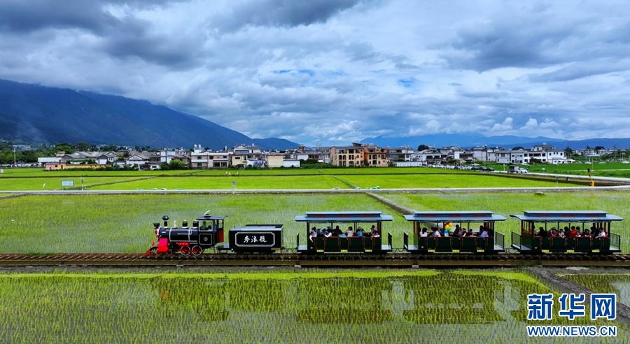 大理喜洲古镇,游客乘坐小火车,畅游田园风光(视频截图)。