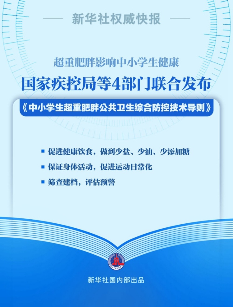 提高全民健康素质,儿童青少年是黄金期。国家疾控局、教育部、国家卫生健康委和国家体育总局22日联合发布《中小学生超重肥胖公共卫生综合防控技术导则》,创新性提出预防为主、早期干预和疾病预警的三级预防策略。