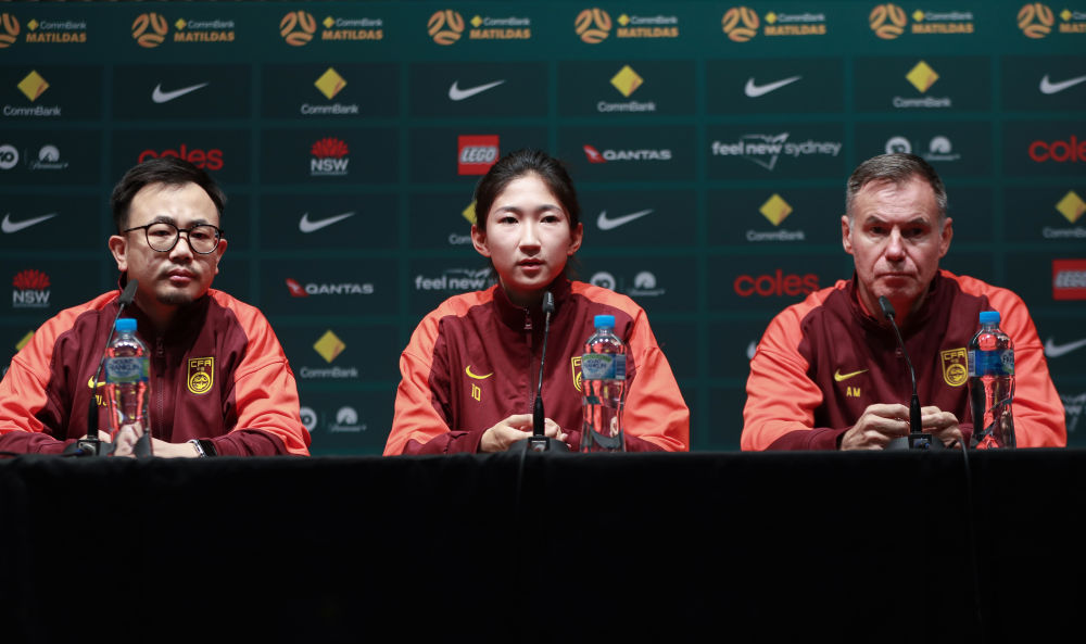 6月2日,安特·米利西奇(右)与王妍雯(中)出席中澳女足友谊赛赛前新闻发布会。新华社记者 马平 摄