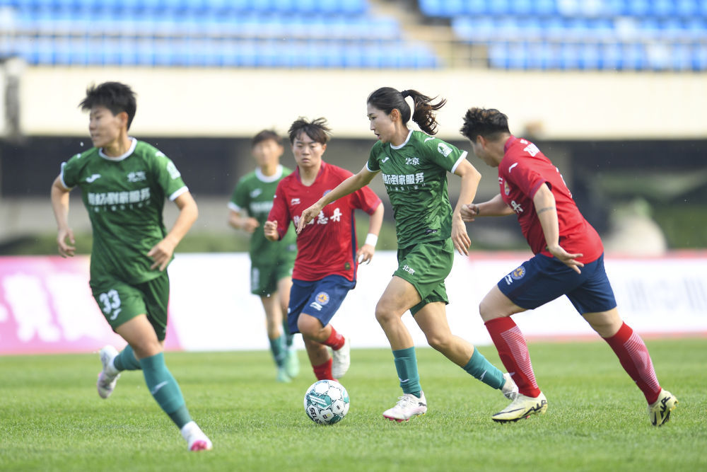 4月13日,王妍雯(右二)在比赛中突破。当日,在北京举行的2024中国足球协会女子超级联赛第三轮比赛中,北京雨虹修缮女足队主场1:0战胜陕西志丹女足队。新华社记者 陈钟昊 摄