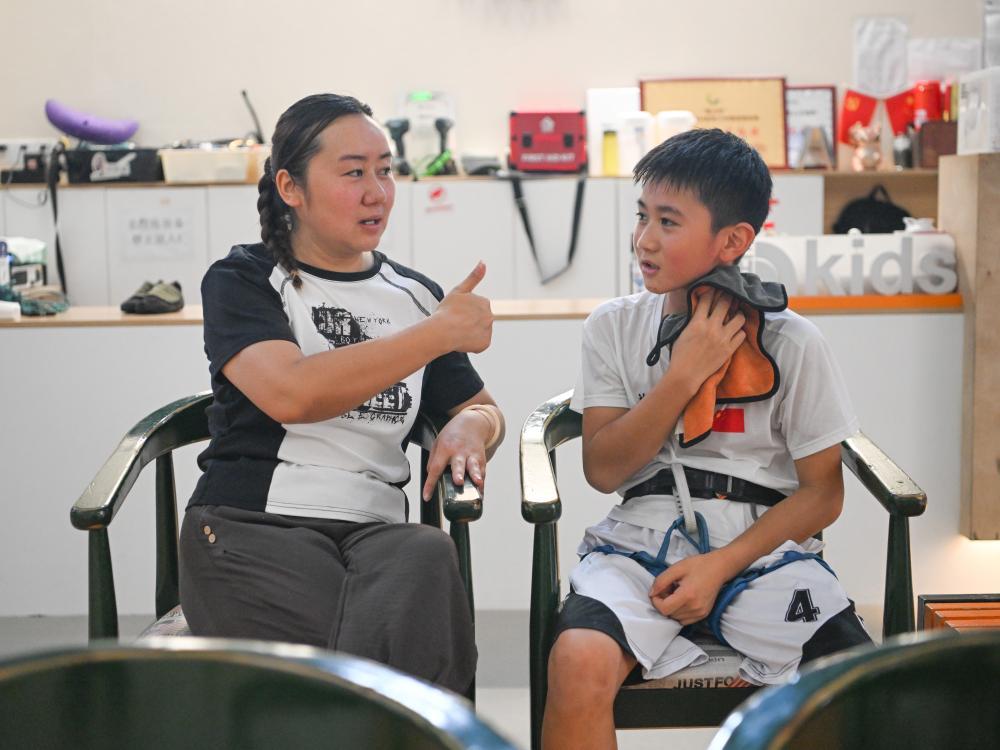 7月16日,方先旻的妈妈在训练间隙鼓励孩子。新华社记者 王曦 摄