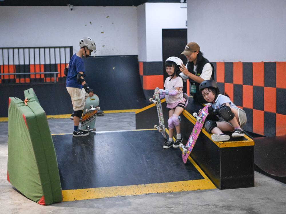 7月17日,閤灵暄(左二)正在进行滑板训练。新华社记者 王曦 摄