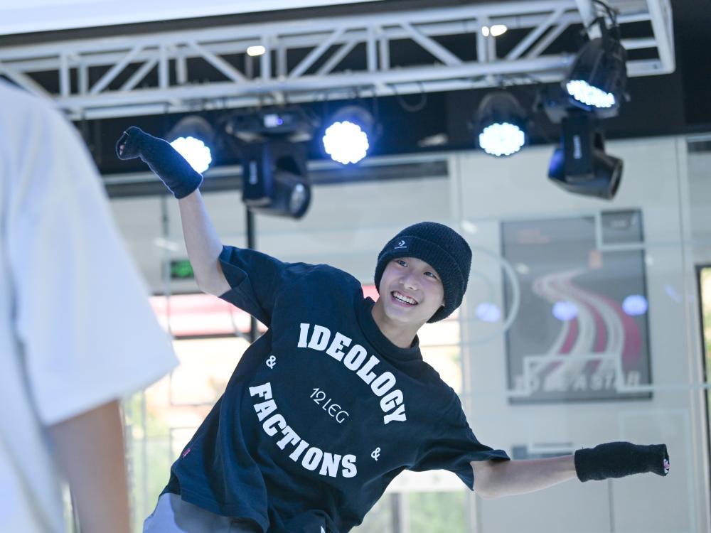 7月16日,张哲瀚(左一)在练习霹雳舞。新华社记者 王曦 摄